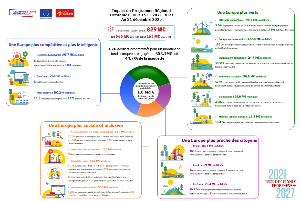 Doté d’un budget global de 829M€ pour l’ensemble du programme 21-27, à la fin de l’année 2025 ce sont 357M€ de financements européens qui ont été attribués à 676 projets déployés dans toute l’Occitanie.